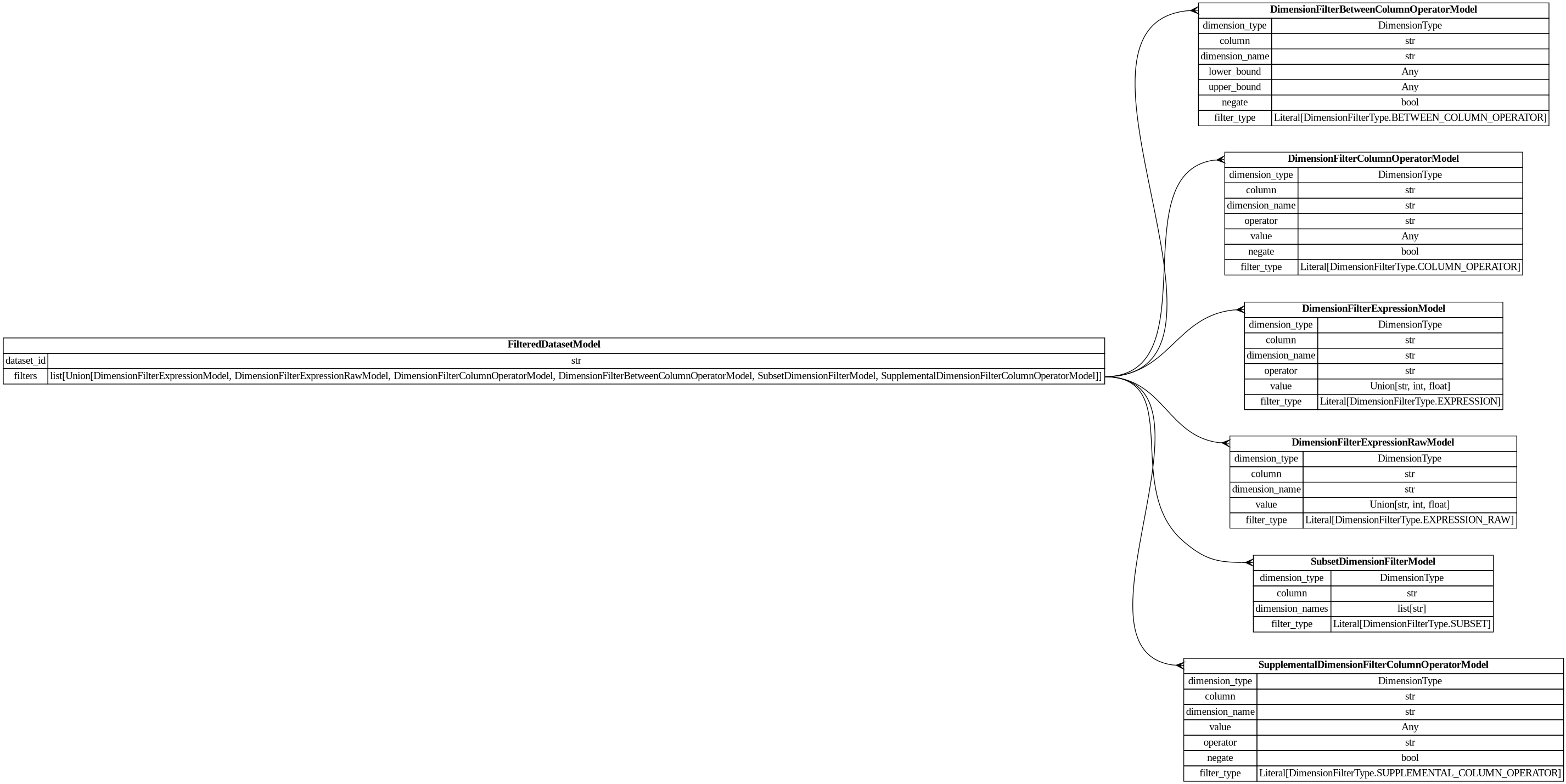 "dsgrid.query.models.FilteredDatasetModel" [label=<<table border="0" cellborder="1" cellspacing="0"><tr><td port="_root" colspan="2"><b>FilteredDatasetModel</b></td></tr><tr><td>dataset_id</td><td port="dataset_id">str</td></tr><tr><td>filters</td><td port="filters">list[Union[DimensionFilterExpressionModel, DimensionFilterExpressionRawModel, DimensionFilterColumnOperatorModel, DimensionFilterBetweenColumnOperatorModel, SubsetDimensionFilterModel, SupplementalDimensionFilterColumnOperatorModel]]</td></tr></table>>,